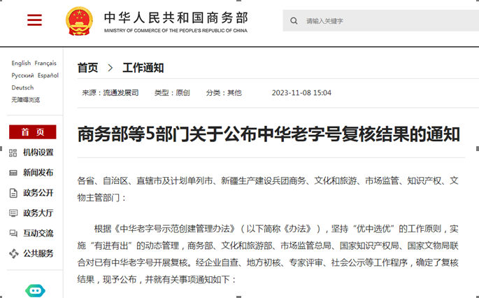 11月8日,商务部等5部门印发关于公布中华老字号复核结果的通知,对已有中华老字号开展复核,经企业自查、地方初核、专家评审、社会公示等工作程序,确定了复核结果并予以公布。